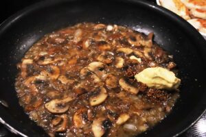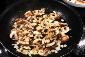 - Add 1 small finely diced onion and 4-5 large thinly sliced Cremini mushrooms to the skillet and sauté until the mushroom, let out their liquid and begin to brown, about 10 minutes.