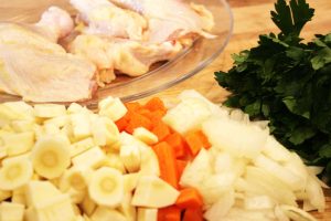 - Peel and chop 1 medium onion, 2 whole parsnips and 1 whole carrot.