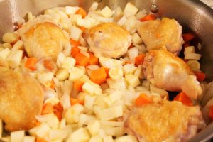 - Turn chicken pieces and sauté for another 2-3 minutes, season the second side, then add chopped vegetables. Sauté over medium high heat for 4-5 minutes, or until the vegetables start to soften. Add 1 cup frozen peas and stir to combine.