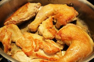 - Heat 1-2 tbsp oil in a medium deep sided skillet over medium high heat. When the oil is shimmering (about 2 minutes) add chicken pieces, skin side down and sear for 3-5 minutes, or until the skin begins to turn golden. Season chicken with kosher salt.