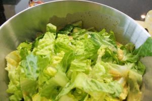 - Drizzle Caesar dressing around the salad bowl, this is to prevent over dressing the salad, if you need more, you can always add more.