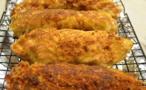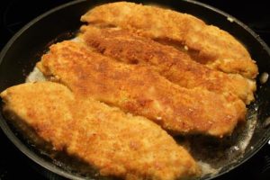 - Heat oil and butter in a large skillet over medium heat. The oil should be hot enough to gently sizzle when you add the chicken logs. There should be enough oil/butter to shallow fry the chicken logs. Fry for 4-5 minutes per side, or until golden.