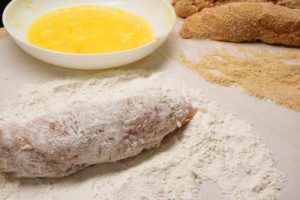 - Roll each chicken roll in flour, then dip in egg wash, and finally coat with the dried bread crumbs.