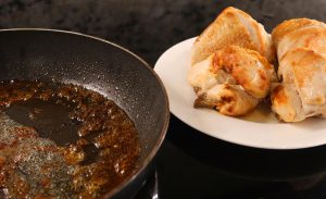 - Remove chicken from pan and add 1 tbsp butter and stir with pan juices until it begins to bubble, then add 1 medium shallot, finely diced, 1 clove grated garlic and 2-3 sprigs fresh thyme, leaves only. Stir to combine and sauté until the shallots become soft, 2-3 minutes.
