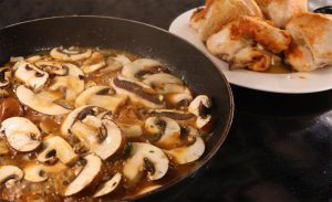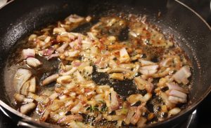 - Add 8-10 medium cremini mushrooms, sliced and stir to combine. Season with kosher salt and freshly ground black pepper to taste and sauté the mixture until the mushrooms have lost most of their juices and start to brown. About 6-7 minutes.