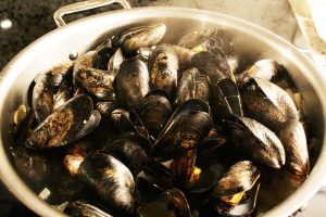 - Add 2 lbs fresh mussels to wine mixture and bring to a boil. Cover and cook for 2 to 3 minutes, or until the mussels have opened.