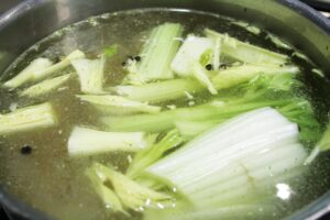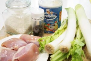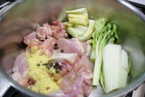 - Cut 4 thighs skinless boneless into 2-3 pieces and add to a medium sized stock pot with 2 whole leeks thinly sliced, 5-6 whole black pepper corn, 2 stalks celery from heart with leaves on and 1 tbsp chicken bouillon granules or Vegeta stock powder. Add 2-3 cups water or enough to cover the contents by 2 inches.