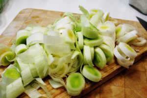 - Wash leeks to make sure that there is no sand remaining between the layers of leeks, then slice into very thin slices (less than 1/4") and add to the simmering broth. Add 2-3 tbsp uncooked basmati rice (optional) and cook for 15-20 minutes or until the rice and leeks are soft and cooked.