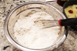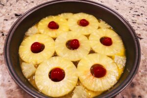 - Place 6-8 slices canned pineapple in the baking pan, starting at the center and working your way out to the edges. Cut remaining pineapple slices into halves or quarters and use these pieces to fill any space between the pineapple rings and arrange 8-10 whole maraschino cherries in the center holes of the pineapple slices.