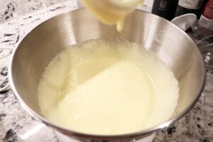 - Reduce speed to low and add 1/2 cup vegetable oil and mix until combined. Add 1 cup 14% sour cream and 1 tsp finely grated lime zest. Stir to combine.