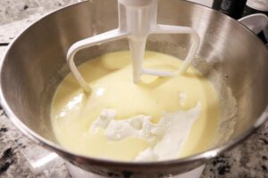 - Combine 2 large eggs and 1 cup sugar in the bowl of a stand mixer and using the paddle attachment, beat mixture on medium high until light and fluffy, about 2 minutes.