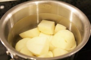 - Peel and cube 2 white potatoes. Add to a medium saucepan, cover with water and bring to a boil. Reduce heat to medium and cook for about 15 minutes, or until potatoes are soft but not mushy.