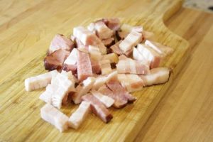 - Slice 1/2 lb smoked bacon in lardons.