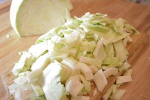 - Cut about 1/3 off from a small head of white cabbage, slice into 1/2" slices and then dice into 1/2" slices.
