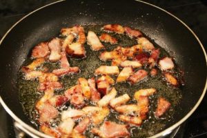 - Add the bacon to the skillet, and cook until the bacon starts to brown, about 6-10 minutes. When the bacon has browned, drain all but about 1 tablespoon of fat from skillet.