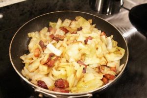 - When potatoes are cooked, drain and smash with a potato masher and add to the bacon and cabbage mixture. Stir to combine. Taste for seasoning and adjust as needed.