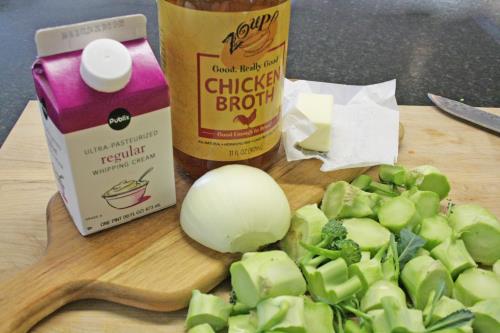 I was making roasted broccoli and after I separated all the florets that I needed, I had all the thick stems left over. I didn’t want to throw the stems out, so I sliced them into 1″ rounds, sautéed them with a little onion, added chicken stock and made Cream of Broccoli Soup!