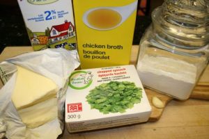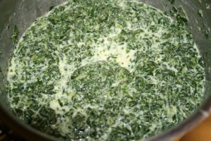 - Slowly add milk, stirring constantly to avoid lumps. Add salt and bring to a boil, then reduce heat to simmer and cook until the sauce has a creamy thick consistency, then add the spinach.