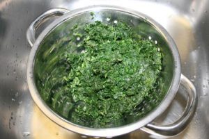 - Defrost frozen spinach in microwave and place in colander to drain.