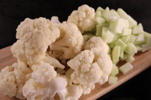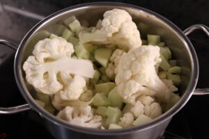- Chop 1/2 medium onion finely and peel 1 whole Granny Smith apple and chop into small squares and separate cauliflower into florets.