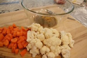 - Add diced carrots and cauliflower and toss to combine, coating both the cauliflower and carrots evenly.