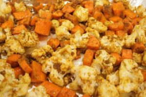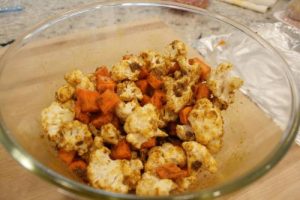 - Add vegetables to a non-stick aluminium lined sheet pan and spread out to make an even layer. Drizzle with a bit of olive oil. Bake in a pre heated oven for 15-18 minutes or until the carrots are firm tender and the cauliflower begins to char around the edges.