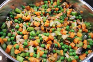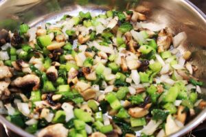 - Add 1 tbsp olive oil to a deep sided skillet over medium heat and 1/2 medium finely diced onion, 2 stalks finely diced celery, 6-8 medium diced white mushrooms and 8-10 sprigs finely chopped fresh parsley. Sauté until the vegetables become soft, about 5-6 minutes.