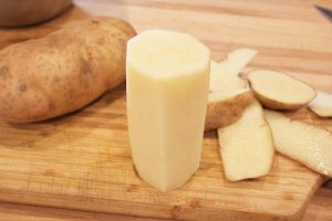 - Cut end off of each potato. Turn potato on end, and using a knife, peel the potato cutting from the top to the bottom and all around the sides. The idea is to try to make the potato uniform and straight sided cylinders