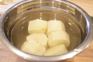 - Place peeled, cut potatoes in cold water for about 5 minutes