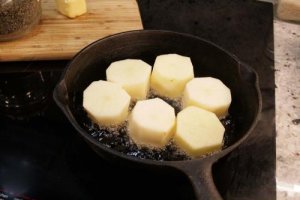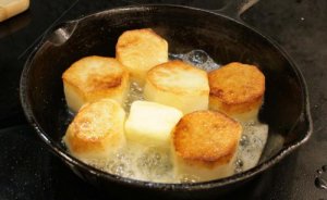 - Turn when the first side has browned, mop up any extra oil in the skillet with a bit of paper towel and then add 2 tablespoons of butter to the pan. Baste the tops of the golden sides of potatoes with a bit of the melted butter and fry potatoes until the white foam from the butter subsides and starts to turn brown.