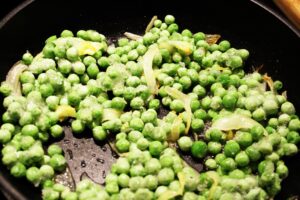 - Add 1 cup frozen green peas the onions and cook for 2-3 minutes.