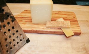 - While the onions are cooking, cut the rind off the Gruyere cheese and grate about of half of a half-pound (.268 kg) slice of cheese.