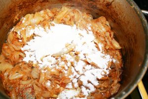 - Sprinkle 2 tbsp all-purpose flour on onion mixture and stir to blend and then add 1 bay leaf, the can of consommé and measure 4 more cans full of beef broth and bring the soup to a boil.