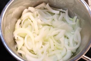 - Peel 3 large Spanish or Vidalia onions, cut in half and then slice a medium thickness.