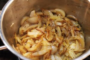 - Heat 4 tbsp olive oil or half oil and half unsalted butter in medium large stock pot over medium high heat, add the sliced onions a cook onions for about 20 minutes, stirring occasionally.