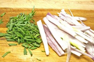 - Peel and slice 1 medium shallot and remove leaves from 4-5 sprigs fresh tarragon or 1 tablespoon dried and rough chop if using fresh.