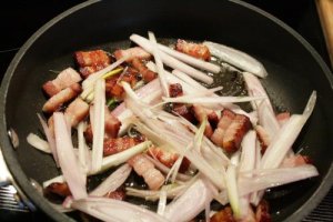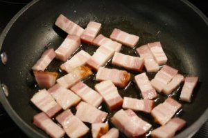 - Heat 1/2 tbsp olive oil in a medium frying pan over medium heat. Cut 1/3 lb smoked side bacon into lardons and add to frying pan and cook for 4-5 minutes, or until the bacon starts to color