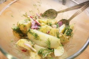 - Drain potatoes and combine hot potatoes with the dressing, toss gently to cover all sides of each potato and serve at room temperature.