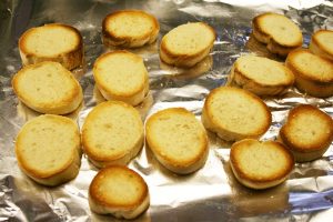 - Slice a French baguette into 1/2" slices and place the slices onto a sheet of aluminum foil.