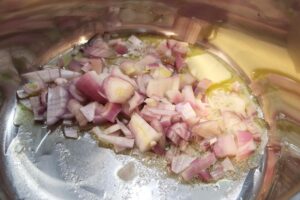 - Heat 1 tbsp olive oil in a deep sided skillet over medium high heat. Add 2 medium finely chopped shallots and sauté until the shallots have softened, about 3-4 minutes. Season with kosher salt and freshly ground black pepper and add 1 pinch cayenne pepper and 1 clove grated garlic stir and sauté until the garlic becomes fragrant.
