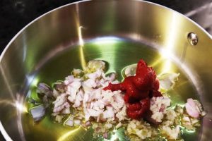 - Combine 2 tbsp olive oil, 1 whole shallot, finely chopped, 2-3 cloves grated garlic, and 2 tbsp tomato paste in a medium skillet. Start with a cold skillet and bring to a simmer over medium heat. Stir and sauté until the tomato paste reaches a deep red color.