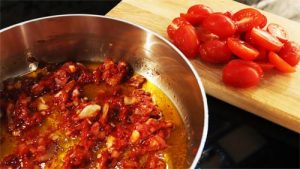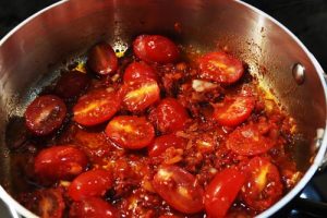 - Remove pan from heat and add 1/2 tsp sweet Hungarian paprika, 1/2 tsp smoked paprika, 1/2 tsp Asian chili sauce (hot), 1 whole bay leaf and 12-14 baby plum tomatoes, halved. Stir to combine and sauté until the tomatoes start to soften, about 4-5 minutes.