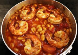 - Increase heat and add 5 large raw shrimp/person to the bean mixture and cook until the shrimp turn pink, about 3-4 minutes per side.