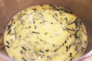 - In another bowl, mix together 4 large eggs and 1 sprig finely chopped rosemary leaves. Gradually whisk in 1/2 cup olive oil, then 3/4 cup milk and mix until combined.