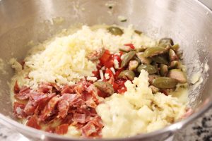 - Fold in 1 whole piquillo pepper, chopped, 3-4 slices salami, chopped, 1/2 cup coarsely grated Gruyère cheese and 3-4 whole coarsely chopped Kalamata olives. Do not overmix, just blend until the ingredients are evenly spread in the batter.