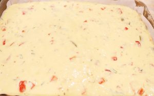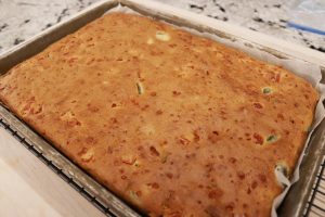 I like the idea of making Gateau Salé in a pan that will yield 1″ x 1″ squares or bars, just the right size for one bite, served warm. Serve with hot honey or top with coarsely grated gruyere or parmesan, not melting just adhering a bit. Maybe a sprinkling of smoked paprika to finish. Bake and freeze in thirds, or what looks right after cutting 12 squares.