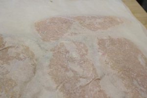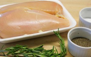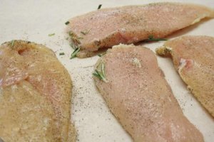 - Place chicken breast on parchment paper, season kosher salt and freshly ground black pepper and sprinkle with the chopped rosemary. Cover with a second sheet of parchment paper and, using a rolling pin, flatten a bit, especially at the bigger ends.