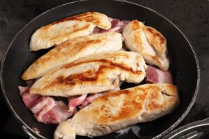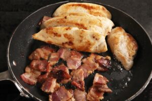 - Add chicken pieces, do not overlap, and cook for 3-4 minutes, then turn, add the chopped bacon to the pan.
