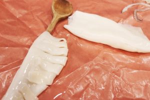 - Using a pair of scissors and a wooden spoon inserted into the calamari, cut slits about 1/3" apart.