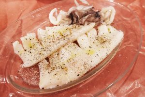 - Rinse and pat dry 1 small whole calamari and tentacles /person.
